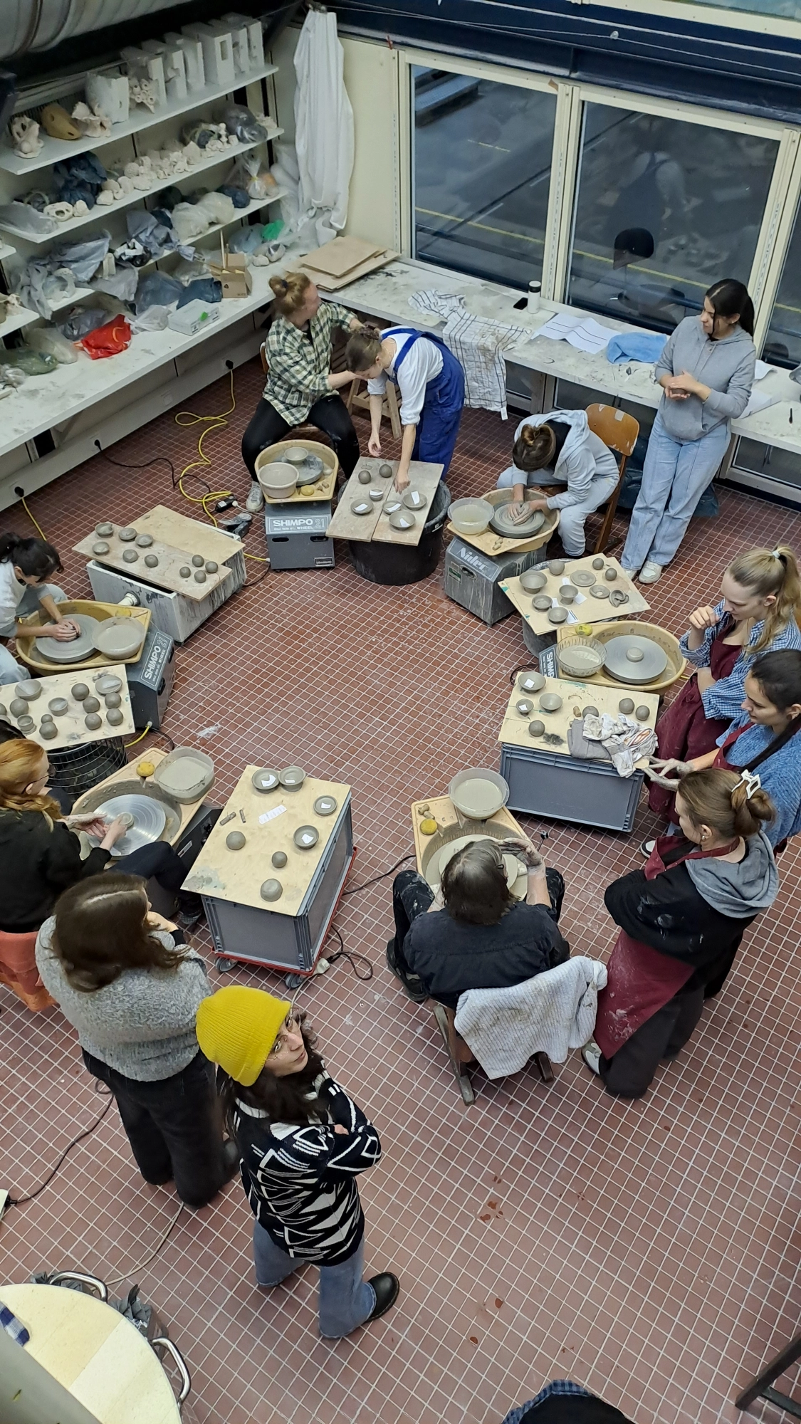 In diesem Kurs lernten die Teilnehmenden zusammen mit der Töpfermeisterin Ulrike Trommsdorrf verschiedene Techniken der Gefäßherstellung kennen, darunter das freie Modellieren und das Drehen auf der Töpferscheibe. Besonders beim Drehen standen die grundlegenden Arbeitsschritte wie Zentrieren, Aufbrechen, Hochziehen, Formgebung und Abdrehen im Fokus. Ergänzend dazu wurde theoretisches Wissen zur Geschichte der Keramik vermittelt – von den Ursprüngen früher Gefäße bis hin zur modernen Keramikkunst.