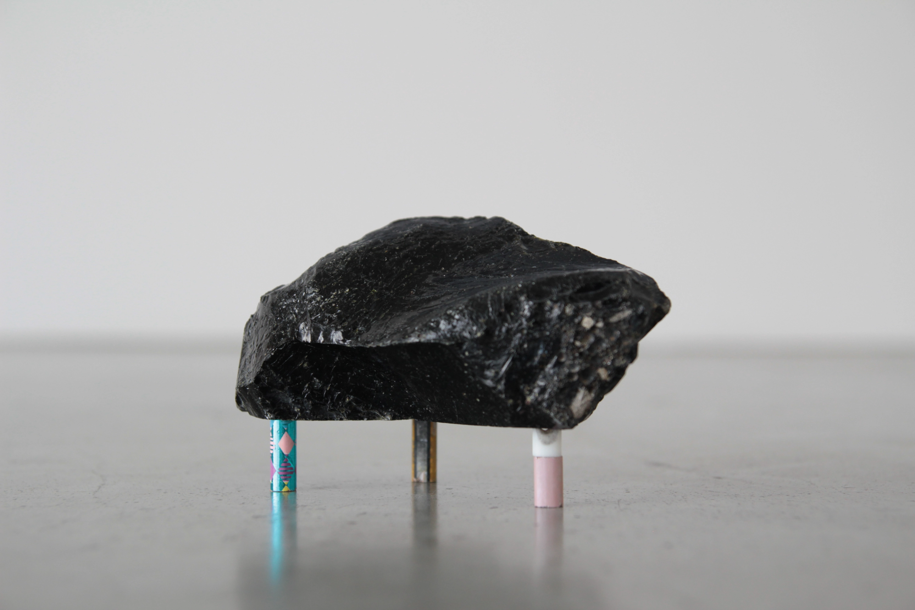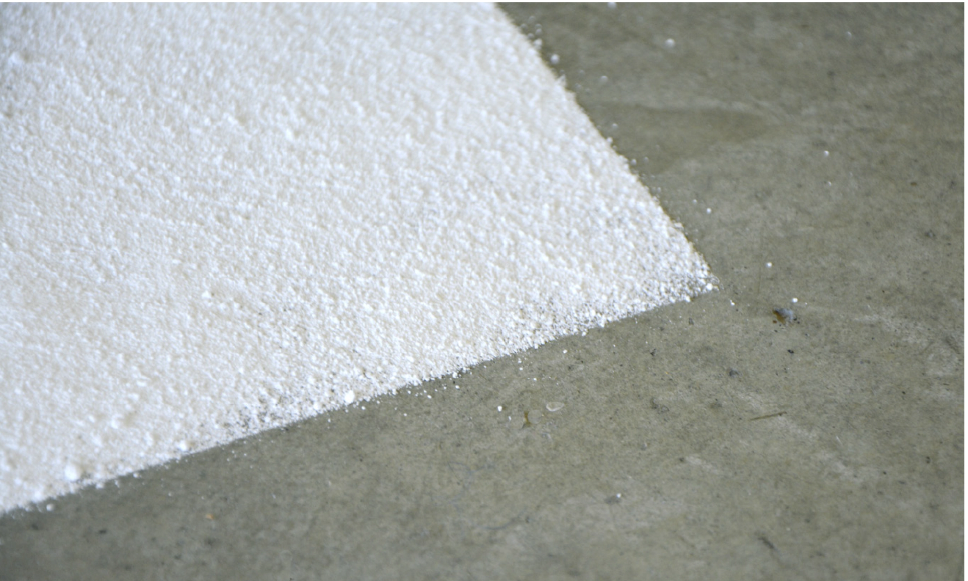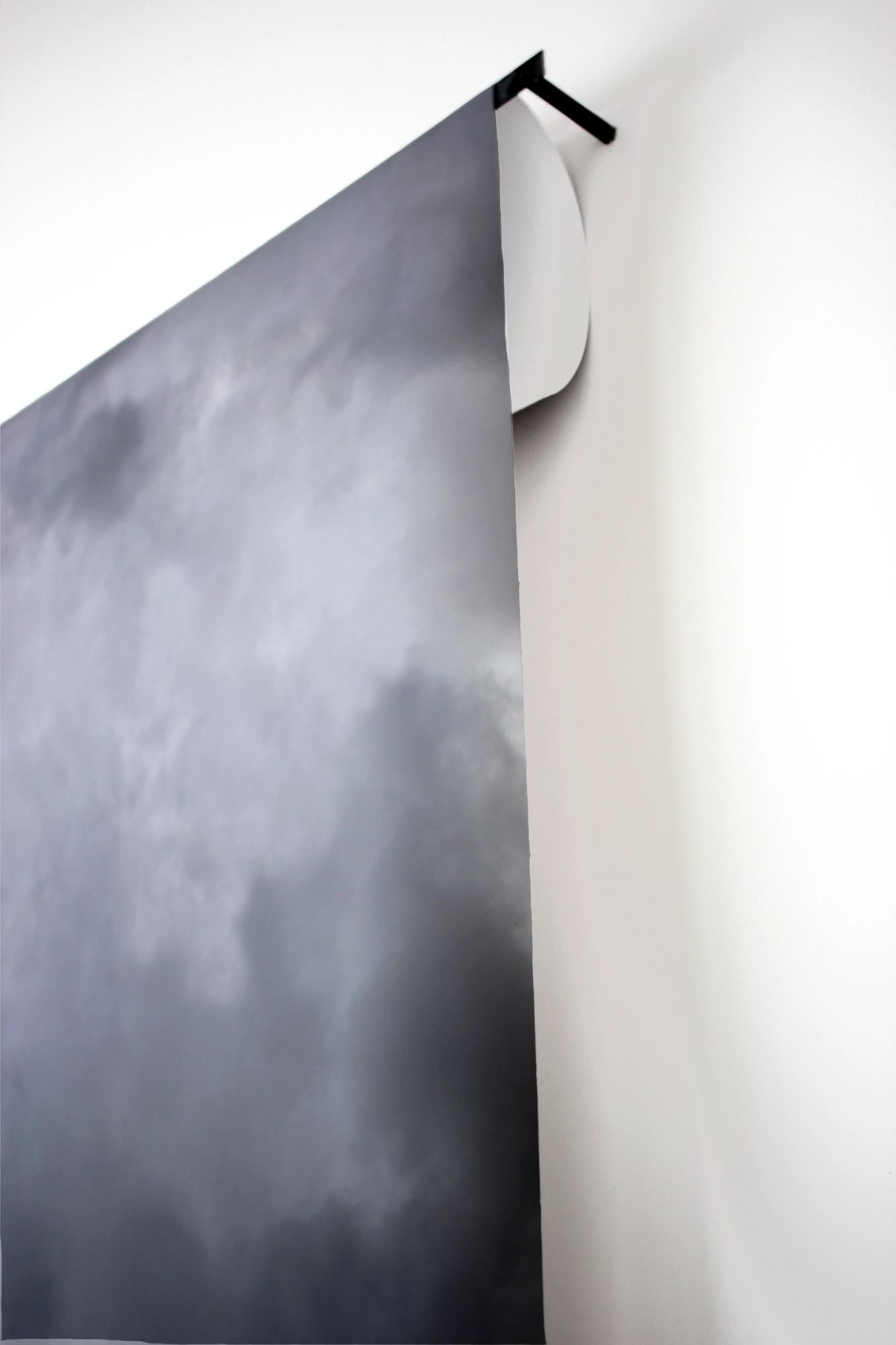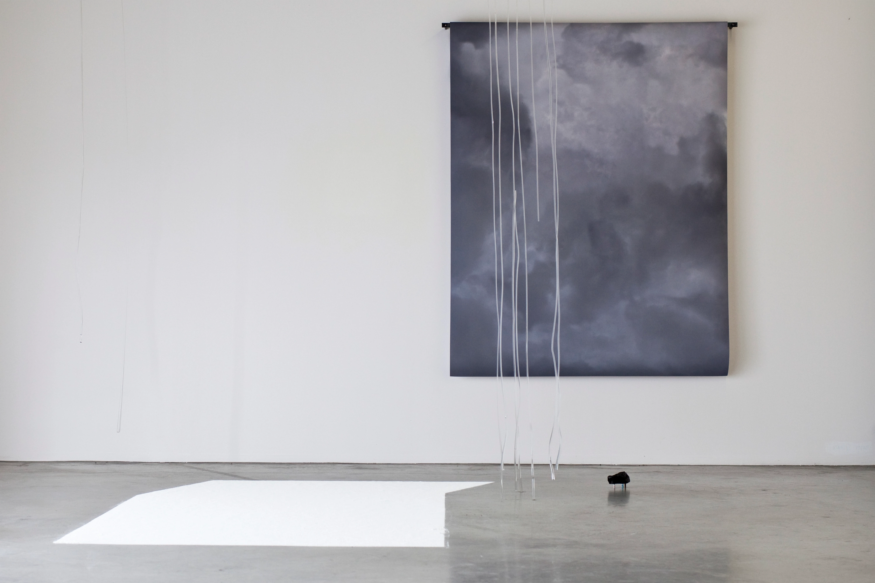 Feld Zoom Zoom Zoom 2015 | Ikob Museum für zeitgenössische Kunst | Fotografie von Wolken (Laserdruck) 3,70 x 1,34 m, Glaslinien durch den Raum 2,80 – 5,05 m, Bleistiftstücke, Feld aus weißem Pigment 3,50 x 2,30 m, Glasklumpen 15 x 8 x 7 cm