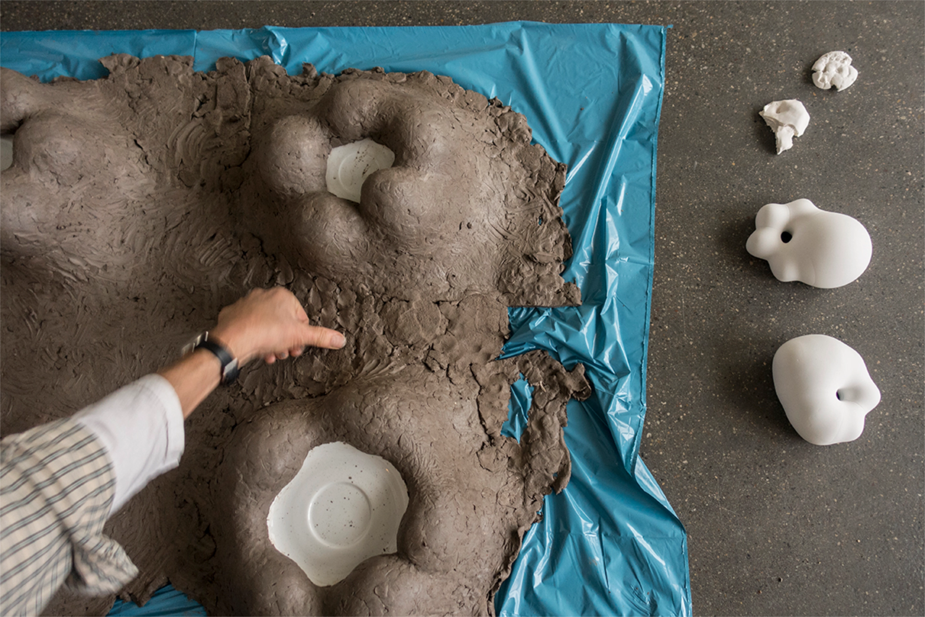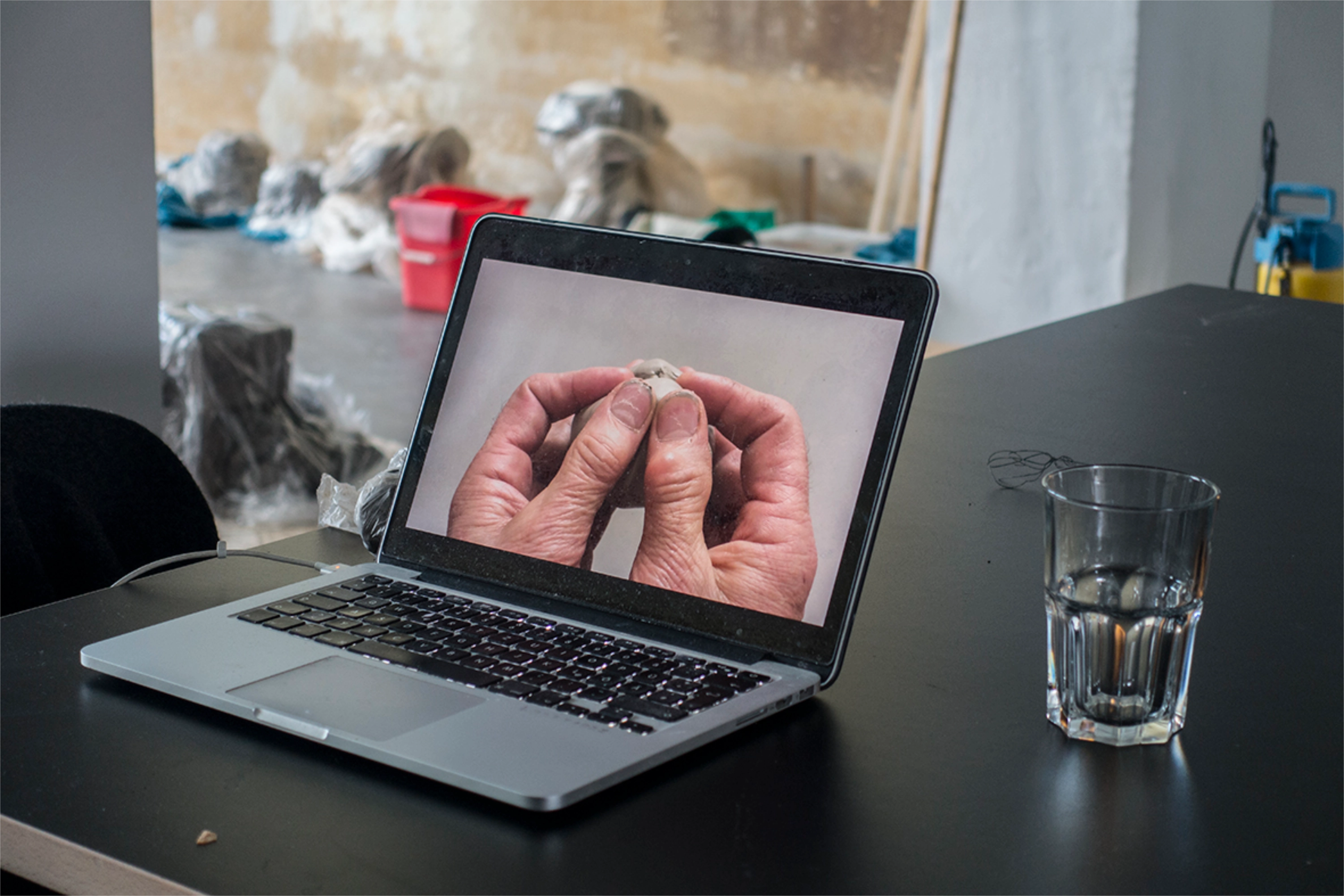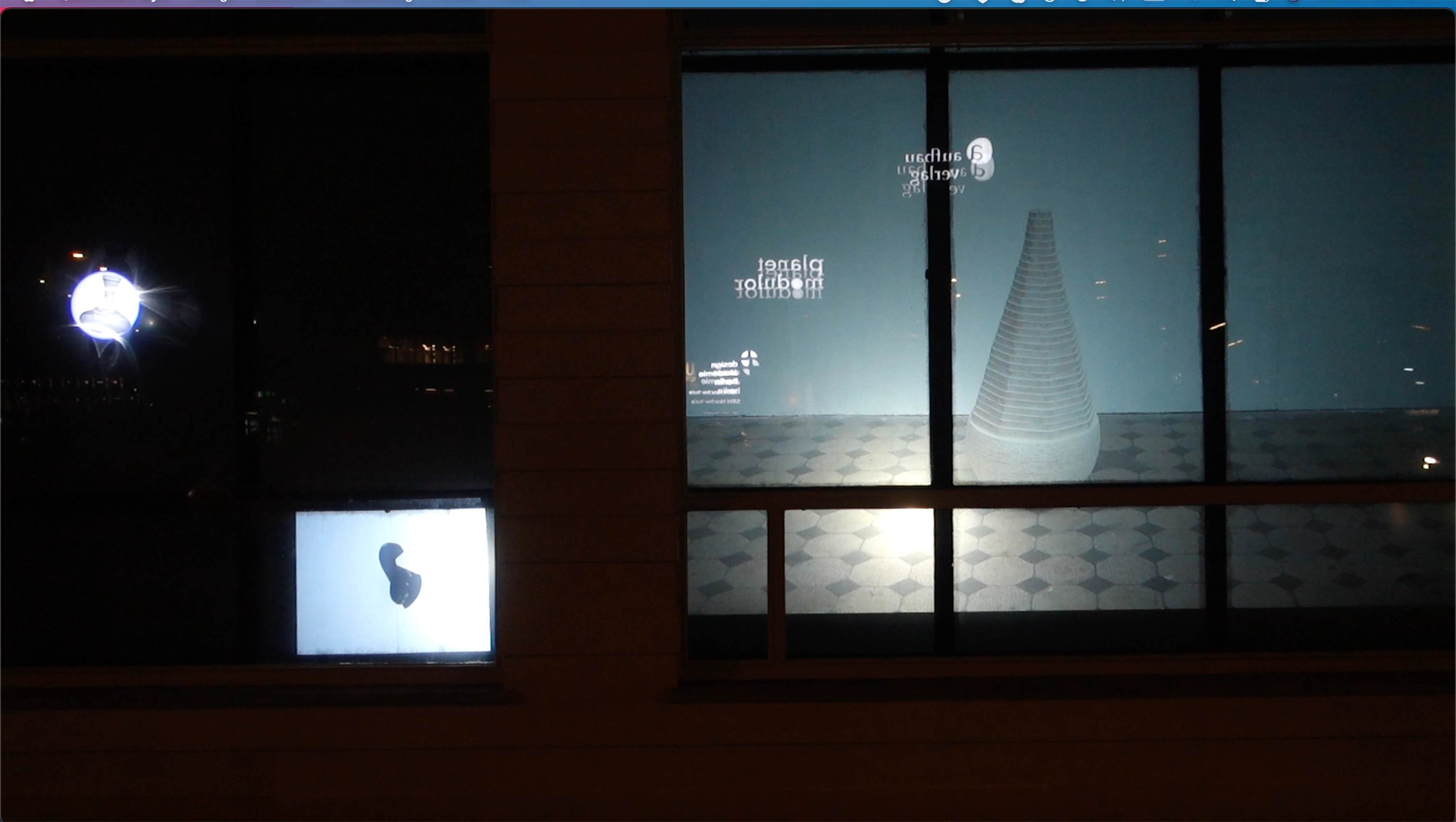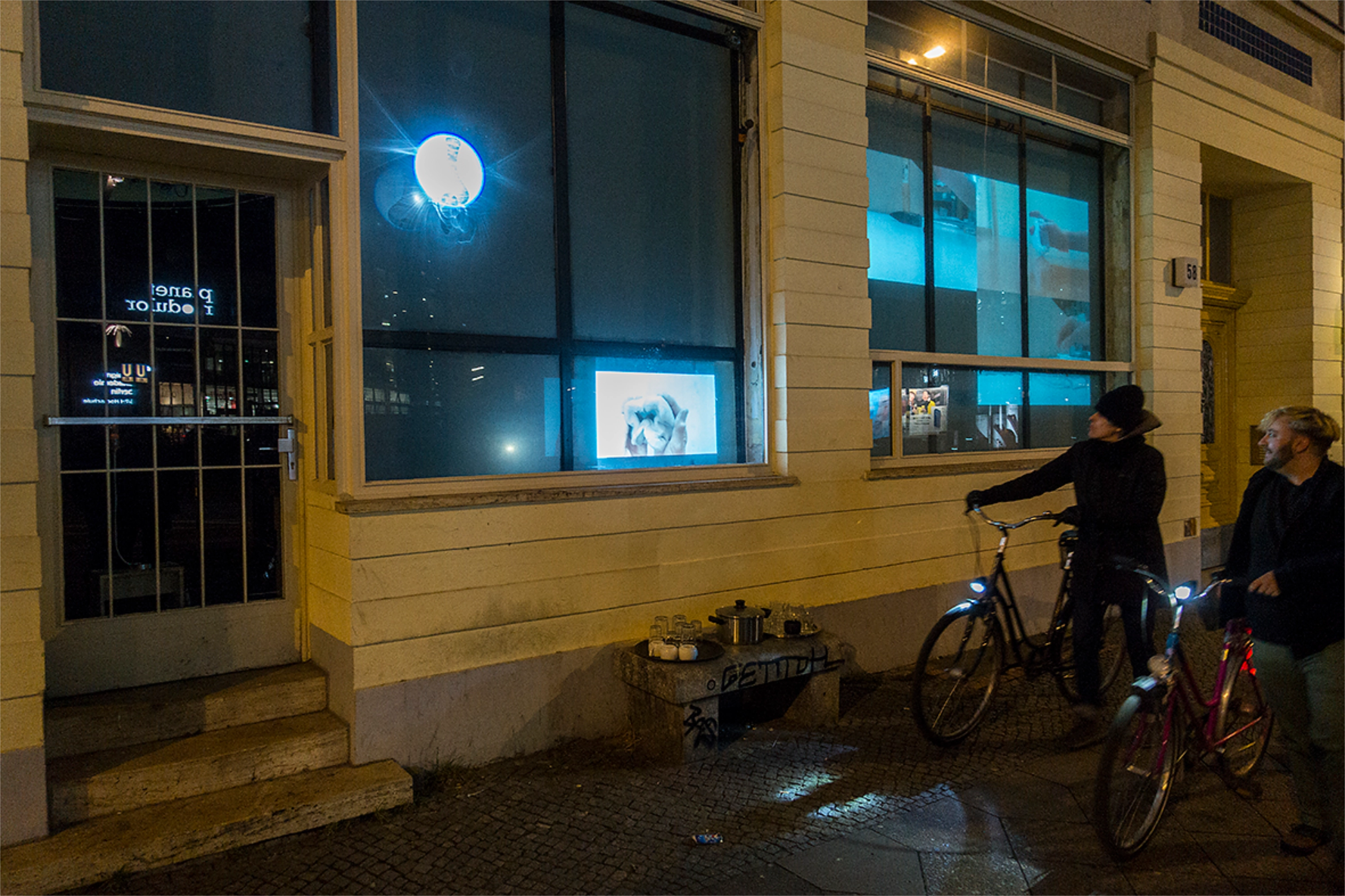 Nach zwei Jahren regelmäßigen Austauschs per Videocall zwischen Jochen Breme (Bonn), Johanna Kintner (Berlin), Nora Mertes (Berlin) und Jens Reichert (Freiburg) arbeiten wir eine Woche gemeinsam im Salon am Moritzplatz und bringen unsere vier plastisch-bildhauerische Positionen in einen Dialog. Der Innenraum des Salons wird dabei zum Begegnungs- und Experimentierort. Die Fensterfront des Salons dient als Projektionsfläche für all das, was im Inneren des Raumes geschieht.