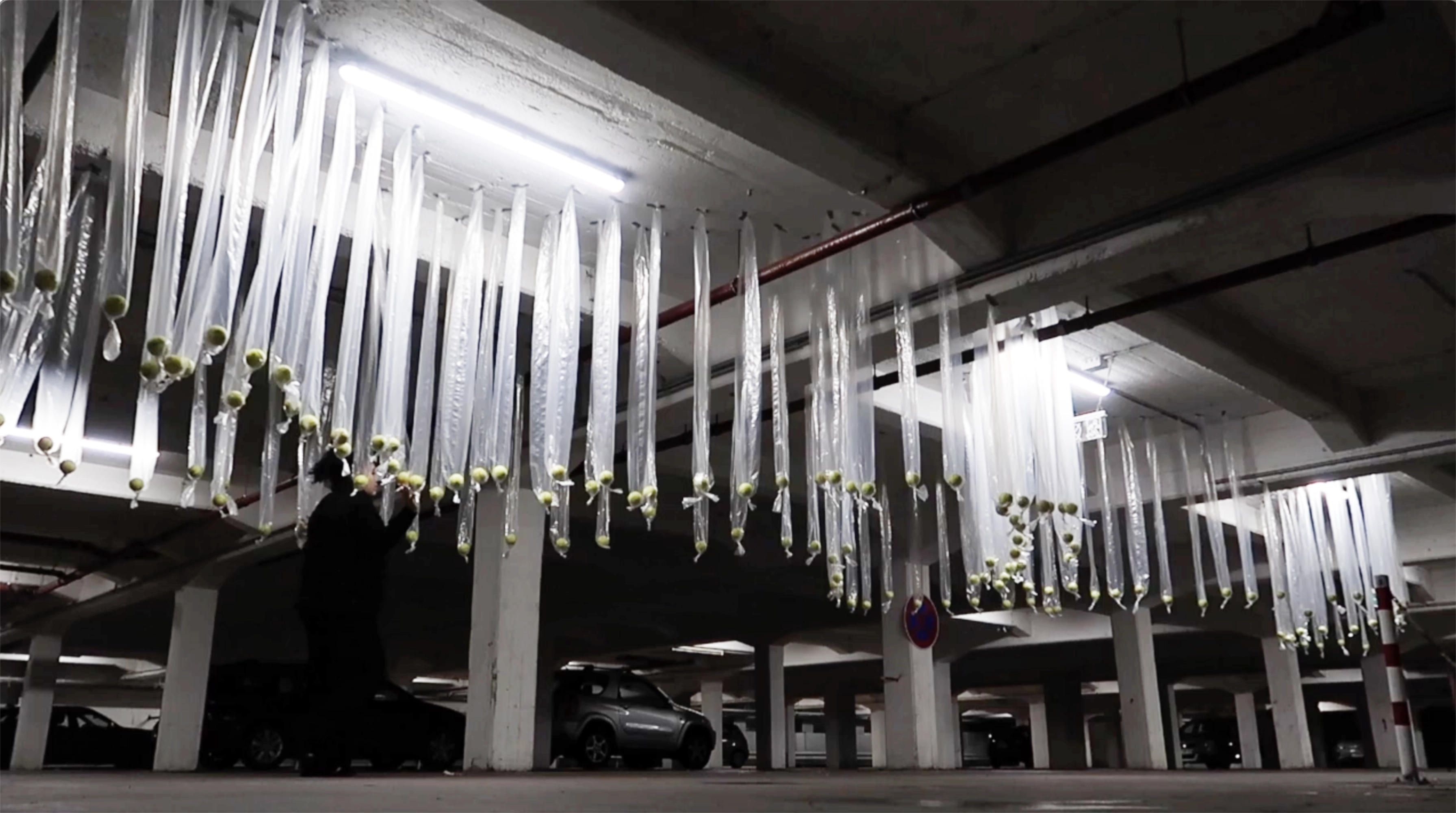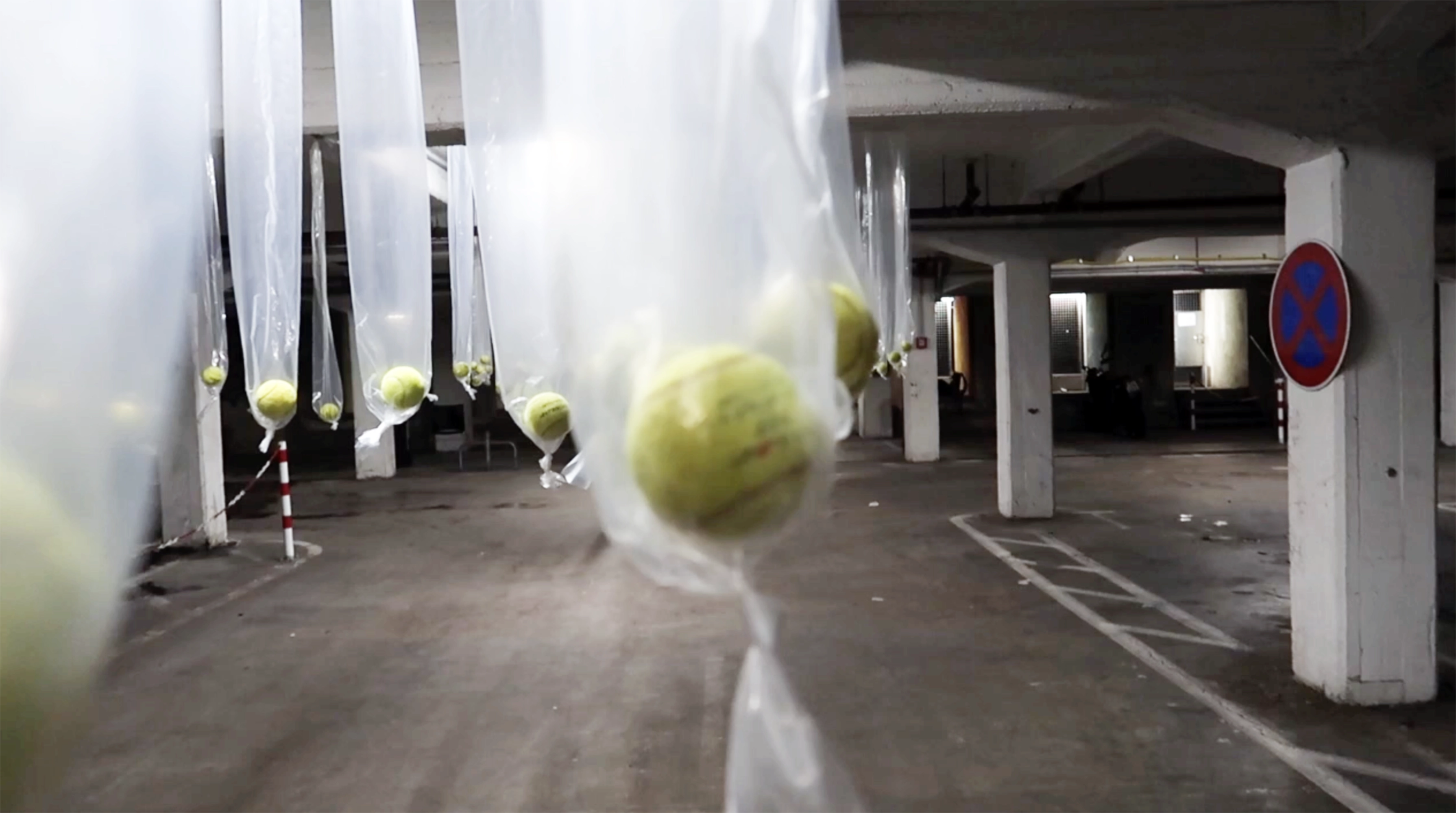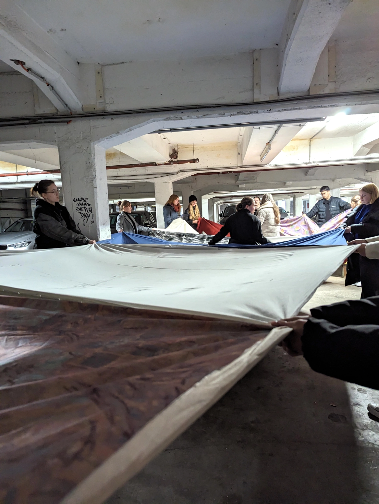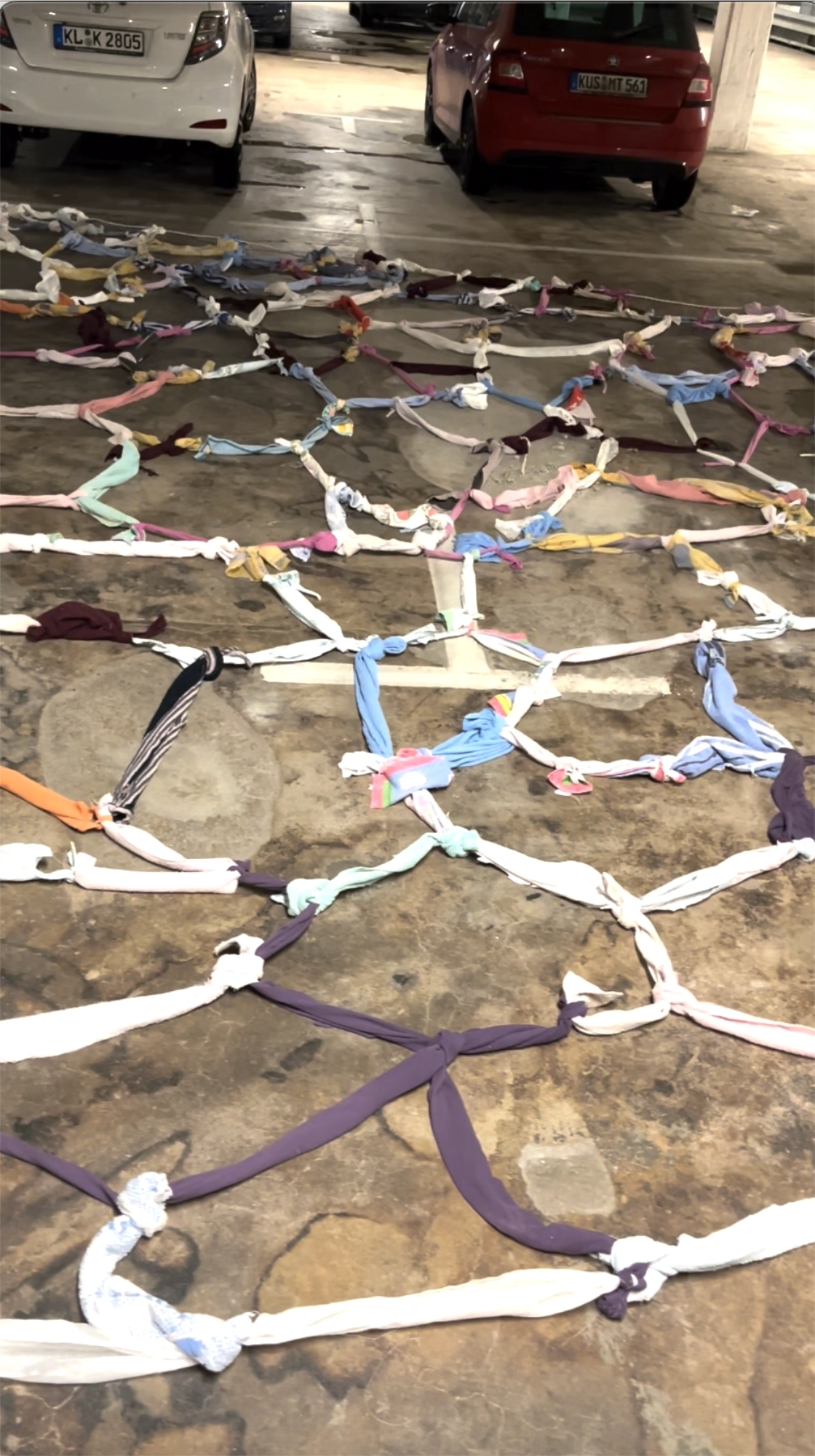 Im zweiten Teil der Veranstaltung lag der Fokus auf Fläche, Linie und Volumen als grundlegenden Phänomenen im Raum. Daraufhin entwickelten kleine Studierendengruppen „fluide Formen“ von Raumkörpern unter Verwendung von Stoff, Dachlatten und Videoprojektionen. Die so entwickelten Formen wurden in der Tiefgarage der Hochschule installiert.
