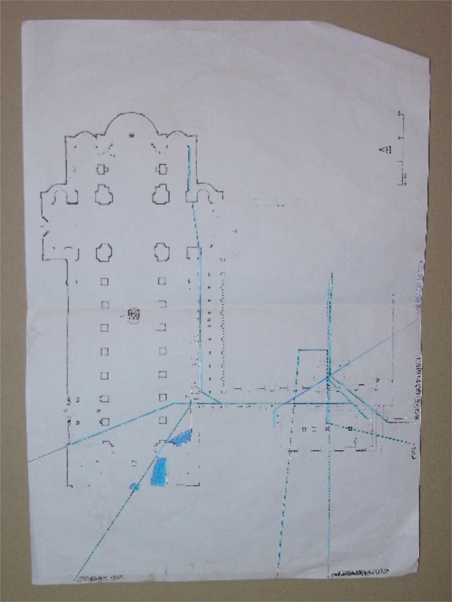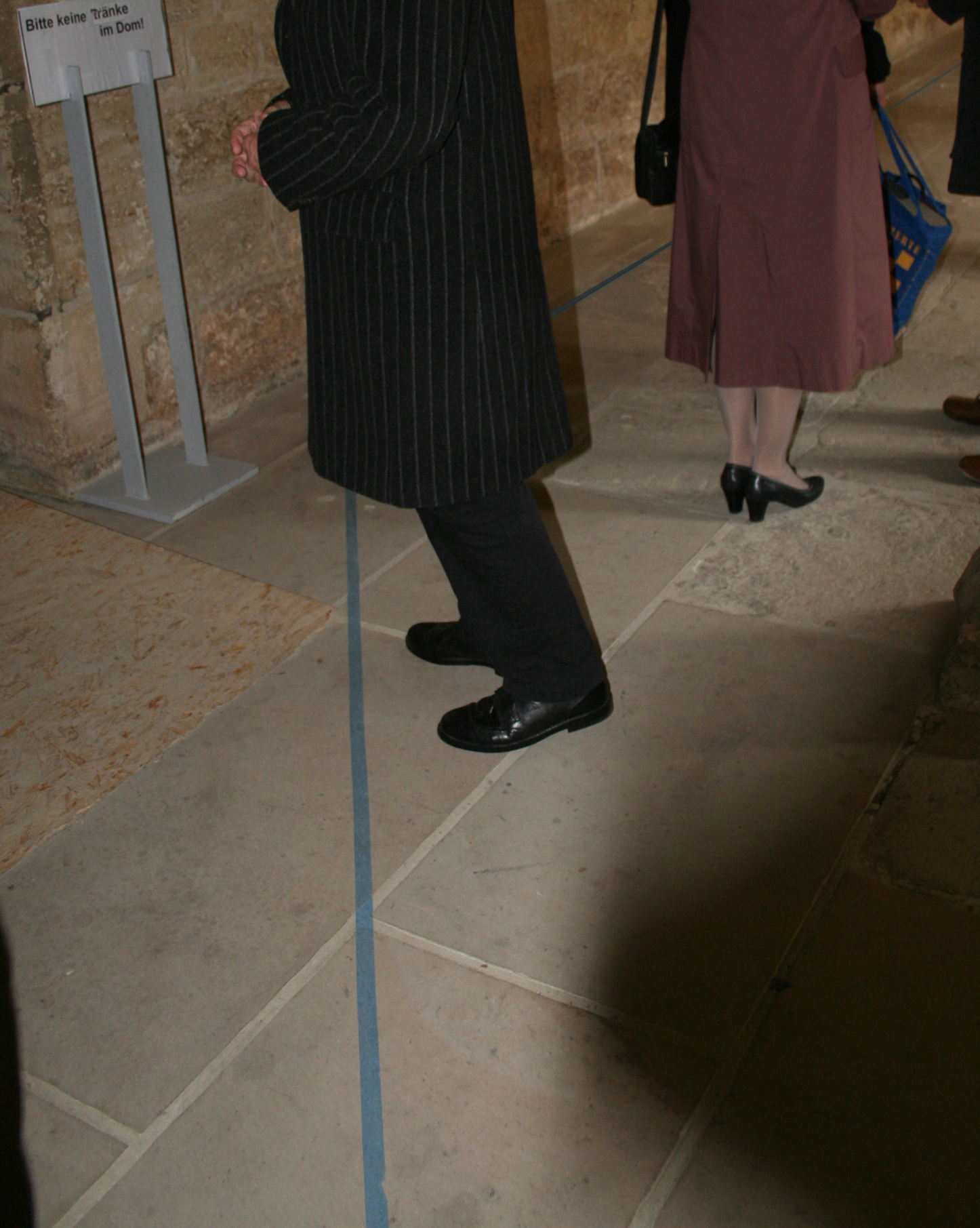 Auf dem Boden des Kaiserdoms in Königslutter haben wir mit blauem Klebeband eine Karte im Maßstab 1:1 erstellt. Diese visualisiert alle bestehenden und äußerst widersprüchlichen Ansichten über das Vorkommen von Wasser unter der Kathedrale. Der Stadtarchivar, der Privatarchivar, der Schamane, der Priester, der Geologe, der Kulturwissenschaftler, der älteste Einwohner und der Cafébesitzer hatten alle unterschiedliche Vorstellungen über diese Wasservorkommen. Keine davon war eindeutig bewiesen. Wir haben alle möglichen Wasserläufe, Wasseransammlungen und Wasserkanäle unter der Kathedrale in Königslutter in Form einer blauen Linie auf dem Boden der Kathedrale visualisiert. Wir haben die Befragten eingeladen, auf dieser – 1:1-Maßstab-Karte – entlangzulaufen. Die Summe aller in unserer visualisierten Perspektiven zeigte ein Wassernetzwerk, das zum Einsturz der Kathedrale geführt hätte.
